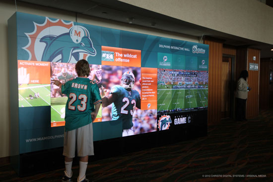 El videowall interactivo de los Dolphins combina un conjunto irregular de 41 cubos modulares de visualización Christie MicroTiles, contenidos de vídeo en vivo y pregrabados, sensores táctiles, aplicaciones para el envío de mensajes y gráficos de gran formato, todo ello formando un enorme muro de más de dos metros de altura.