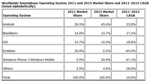 Por sistemas operativos, y según la consultora, Android arrasaría el mercado en el año 2015 con una cuota de uso superior al 45 por ciento. El iOS de Apple tendría en ese año un 15,7 por ciento, el Blackberry OS de RIM un 14,9 por ciento.