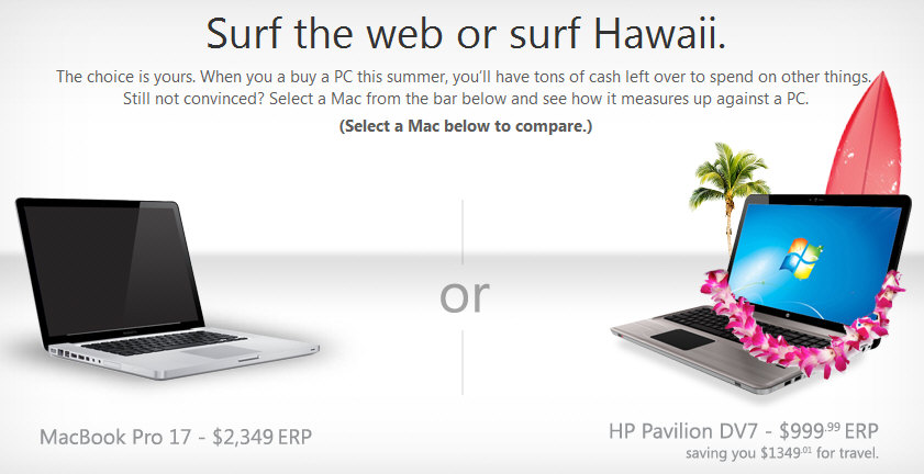 ‘Navegar por la web o navegar por Hawaii’, es el principal eslogan del portal sugiriendo que con el mismo dinero que cuesta adquirir un ordenador de Apple puedes comprar uno con Windows e irte de vacaciones