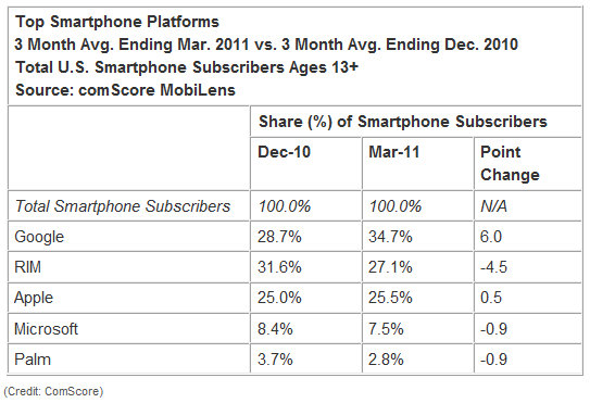 El sistema operativo móvil de Google consiguió aumentar seis puntos porcentuales de cuota de mercado en el primer trimestre del año según la firma de análisis. Aumento de cuota conseguida principalmente a costa de RIM que baja hasta el 27 por ciento.