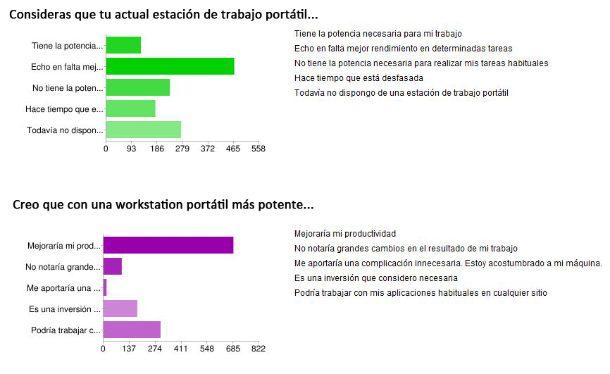 La mayoría de los usuarios opina que necesita más rendimiento en su workstation portátil para ser más productivo y más de un 40% consideran que su máquina está desfasada. En el lado contrario un 31% considera que su estación de trabajo portátil satisface sus necesidades sin problema alguno.