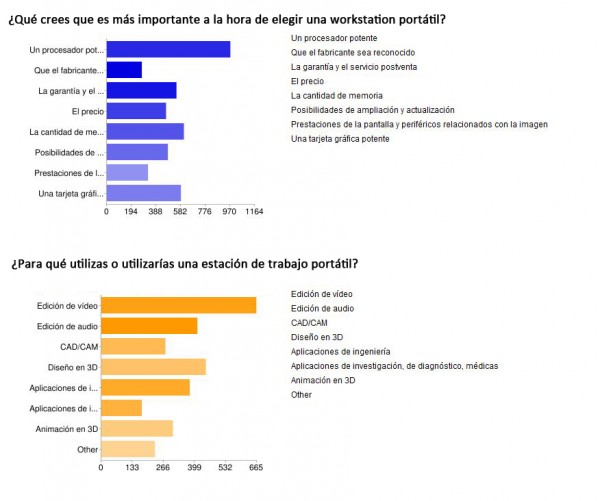 En lo relativo al uso de workstation portátiles la edición de vídeo y audio profesional aparecen como las labores más habituales entre nuestros lectores, seguida de las aplicaciones de diseño CAD/CAM y 3D. En los próximos días publicaremos algunos casos de éxito donde las workstation portátiles suponen un elemento fundamental del flujo de trabajo de algunas empresas.
