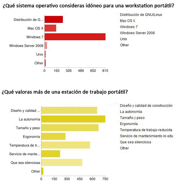 El panorama de sistemas operativos no revela sorpresas. Windows aparece en posición muy destacada y casi el 80% de los usuarios lo consideran el sistema operativo ideal para ejecutar las aplicaciones que necesitan. Las distribuciones de GNU/Linux son la alternativa perfecta para un 36% de nuestros usuarios mientras que menos del 20% optarían por el sistema operativo de Apple, a pesar de que la compañía no dispone de workstations portátiles en su catálogo.
