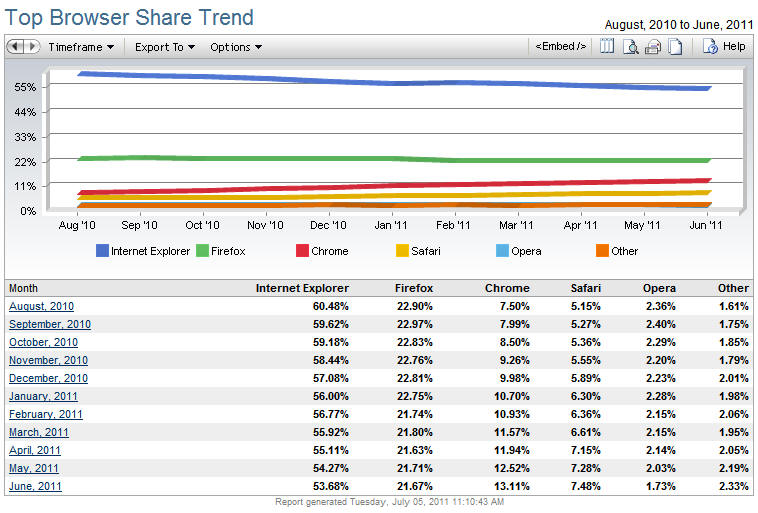 Según los datos de la firma de análisis NetApplications el Chrome de Google superaría el 13 por ciento de cuota de mercado en junio de 2011 y de seguir la tendencia, en un año duplicaría la cuota de uso desde el 7,50 por ciento de agosto de 2010.
