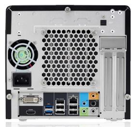 Puede equipar hasta 16 Gbytes de memoria RAM DDR3 y grandes cantidades para almacenamiento con dos discos duros (4 Tbytes máximo) o dos unidades de estado sólido (512 Gbytes máximo). También unidad óptica combo con reproductor Blu-ray y grabador DVD, LAN Gigabit Ethernet, sistema de audio de siete canales, dos puertos USB 3.0 y entradas de vídeo DVI y HDMI.
