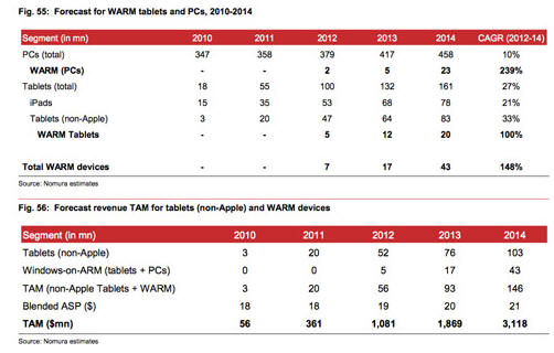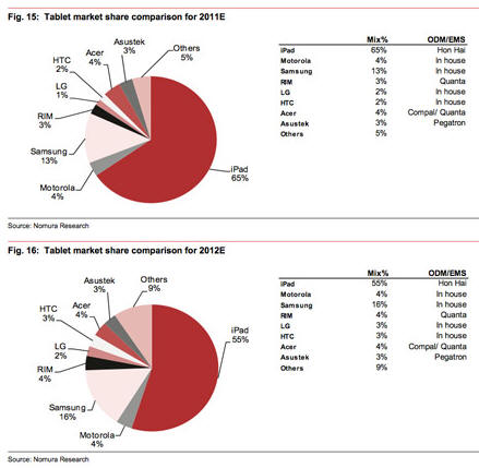 A corto plazo según Nomura, sólo Samsung con los Galaxy Tab bajo Android serán capaces de hacerles frente. Ya en 2012, la situación iría variando y la cuota de mercado de los iPad se reduciría al 55 por ciento, desde el 65 % actual y el 90 por ciento de 2010. Para 2014, Apple perdería la mayoría de tablet en el mercado aunque seguiría siendo el primer productor mundial por fabricantes.