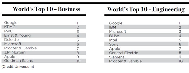 Microsoft en el sexto puesto y Apple en el noveno, completan el top-10 del listado general, mientras que IBM, Intel y Sony, completan los primeros puestos entre las empresas más atractivas por los trabajadores con formación en ingeniería, seguidas de otras grandes tecnológicas como HP, Cisco, Oracle, Nokia, Dell y Lenovo.
