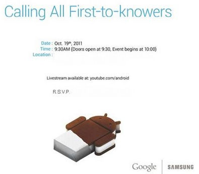 Samsung y Google han anunciado un evento en Hong Kong para el 19 de octubre donde se presentará la próxima versión mayor del sistema operativo móvil Android 4.0 Ice Cream Sandwich y la nueva generación de smartphones internos de Google Nexus Prime.