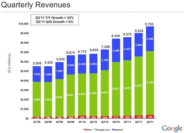 Google ha reportado un aumento de ingresos brutos del 33 por ciento frente al mismo trimestre del año anterior para un total de 9.720 millones de dólares. En cuanto a beneficios el aumento ha estado cercano al 30 por ciento hasta 2.730 millones de dólares.