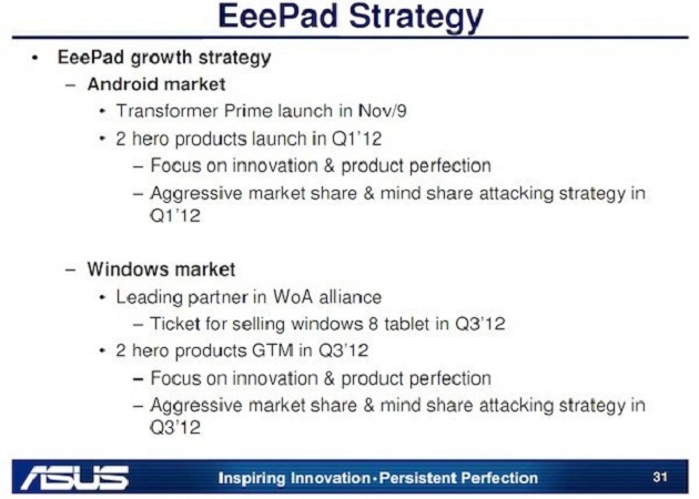 Pero no sólo se centrará en Android, en el roadmap también se ha podido ver que Asus lanzará dos gobernadas por Windows 8, que llegarían en el tercer trimestre del próximo año. Tal y como afirmaba la propia compañía, tanto para Android como para Windows 8, «planea centrarse en la innovación y perfección del producto, adoptando una estrategia agresiva para ganar cuota».