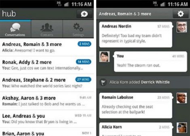La principal novedad de Hub, es que los usuarios pueden enviar mensajes de texto SMS gratuitos desde su aplicación a aquellos que no tienen instalada la aplicación. Los mensajes SMS se mandan usando la conexión del terminal, Wi-Fi o 3G, y pueden enviarse a terminales internacionales sin coste, pero sí puede tener coste para el que recibe el mensaje en el extranjero.