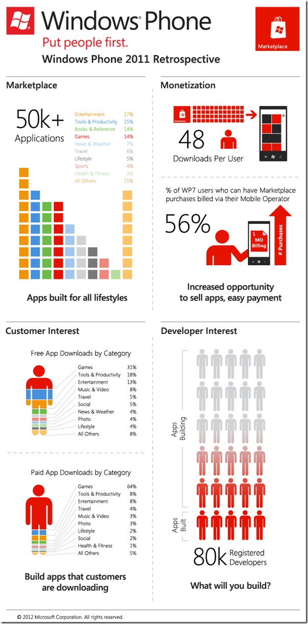 Windows Phone sigue luchando para ponerse al nivel de sus máximos rivales iOS y Android, quienes dominan el mercado móvil indiscutiblemente. Ahora Microsoft, ha publicado una infografía en la que desgrana algunos detalles de su sistema operativo móvil. La compañía habla sobre el número y el tipo de aplicaciones, el interés de los desarrolladores y sobre el tipo de contenidos que más interesan a los usuarios.