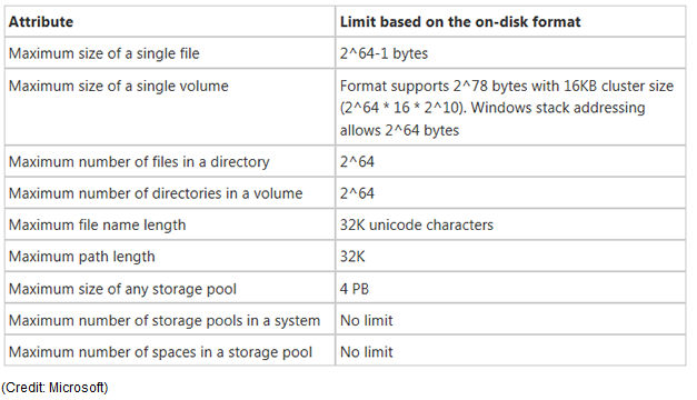 Frente a él, ReFS, está construido sobre la base del sistema de archivos actual NTFS, manteniendo retrocompatibilidad con él pero aumentando la fiabilidad de la verificación de datos, corección de errores y escalabilidad. ReFS supera a NTFS en la longitud de archivos, directorios o volúmenes de disco como se puede ver en la imagen siguiente: