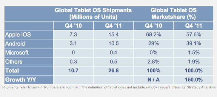 Algo que habría empezado a ocurrir según la firma Strategy Analytics que asigna una cuota de mercado del 39 por ciento a Android tras ganar diez puntos porcentuales el último año. El mismo porcentaje que pierde el iPad de Apple situado en el último trimestre de 2011 en el 57 por ciento tras su gran monopolio anterior.