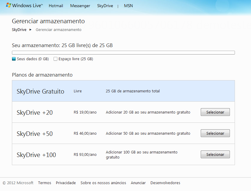 Unas capturas de pantalla de SkyDrive muestran la inminente ampliación del servicio de almacenamiento en nube con opciones de espacio adicional de 20, 50 o 100 Gbytes, bajo pago anual de 19, 46 y 93 dólares respectivamente, a sumarse a los 25 Gbytes base gratuitos.