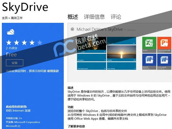 Pantalla de aplicación en este caso del servicio de almacenamiento en nube SkyDrive, con dos marcos separados que muestran icono, clasificación y precios, botón de la instalación, captura de pantalla, información detallada y opción de comentarios.