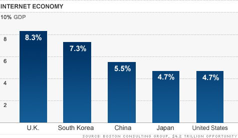 Analizados los países del G-20, el Reino Unido estaría a la cabeza mundial por actividad económica generada por Internet con nada menos que el 8,3 por ciento de su PIB actualmente y por encima del 12 por ciento en 2016. Le seguiría en el pódium Corea del Sur y China.