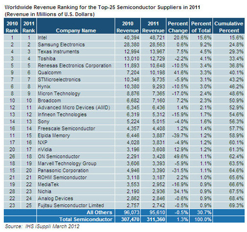 Conviene reseñar que una buena parte del explosivo aumento de ingresos de Intel se debió a la compra de Infineon. En todo caso el gigante del chip, aguantó el órdago de los diseños RISC de ARM que monopolizan el mercado de la movilidad (smartphones y tabletas) con Samsung a la cabeza, y con Qualcomm como el fabricante que más creció en 2011, más de un 40 por ciento.