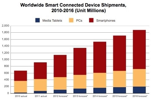 Buena parte de culpa de este cambio que la consultora considera ‘dramático’ se debe al crecimiento de los ‘dispositivos móviles conectados’ como IDC llama a smartphones y tablets, que doblarán sus ventas desde 2011 a 2016, año en el que se fabricarán 1.840 millones de unidades.