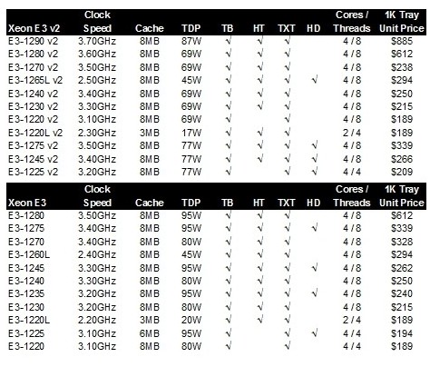 A destacar el lanzamiento de los E3-1200 v2, los primeros procesadores Xeon basados en la plataforma de consumo Ivy Bridge y que están destinados a placas con único socket y para pequeños servidores Pymes y estaciones de trabajo. Un TDP de 17 vatios para el modelo Xeon E3-1220L habla del ultraconsumo de estos modelos.