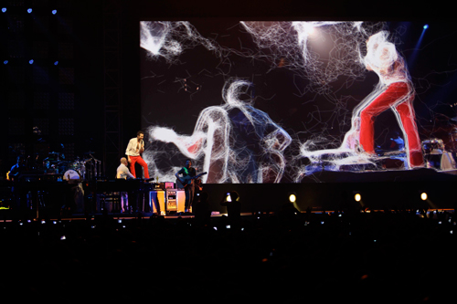 El equipo de siete personas de STS (cuatro cámaras y tres operadores de control), liderado por el director de vídeo Emigliano Napoli, alimenta de contenidos de vídeo a los dos proyectores DLP Christie 2048×1080, suspendidos a aproximadamente 8 metros de la pantalla en la estructura de iluminación que sobrevuela la pasarela que parte del escenario principal. STS ha utilizado un sistema de producción de vídeo HD completo, con tres cámaras HD de Sony (una delante del escenario, una cámara de sala y una tercera sobre el hombro). Una Polecam con cámara Toshiba 1/3” 3-CCD HD y una cámara Canon EOS 5D en formato vídeo, se emplearon en uno de los números para crear un efecto cinematográfico «más cálido».
