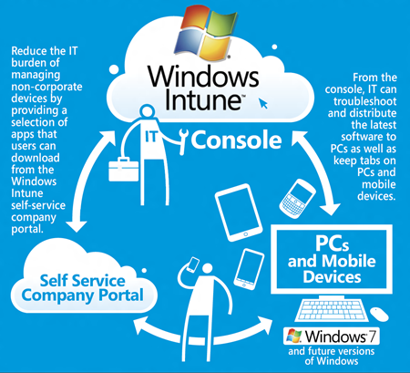 Windows Intune, el servicio on-line de Microsoft de gestión y protección de ordenadores en la nube, hace posible el acceso a un control centralizado de todos los dispositivos y permite la actualización a las últimas versiones de Windows, actualmente Windows 7 Enterprise y a la futura versión de Windows 8 cuando esté disponible.