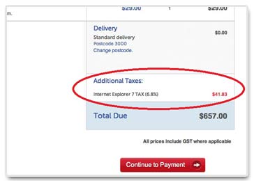 No, no estamos en el día de los inocentes, parece que la primera tasa mundial por uso de navegador está en marcha, con un recargo del 6,8 por ciento sobre el total de la compra para los clientes que accedan con IE 7.