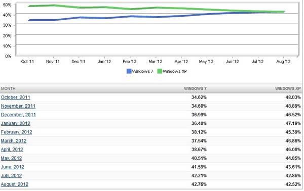 Aunque era cuestión de tiempo es la primera vez que la suma de las distintas ediciones de Windows 7 (42,76 por ciento de cuota de mercado) supera a Windows XP desde su lanzamiento el 22 de octubre de 2009.