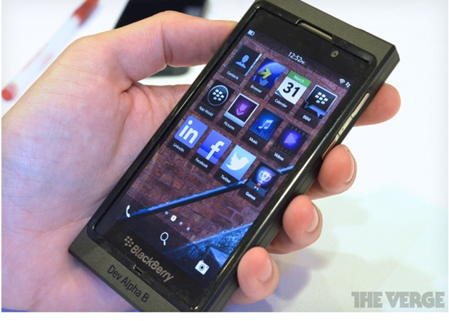 El terminal mostrado corresponde al BlackBerry Dev Alpha B, un modelo de nuevo diseño, sin el popular teclado físico QWERTY, con una pantalla multitáctil de 4,2 pulgadas de diagonal y resolución de alta definición con 1280 x 768 píxeles.