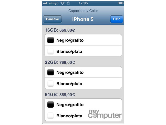 – 669 euros (iPhone 5 con 16 Gbytes de capacidad de almacenamiento interno)