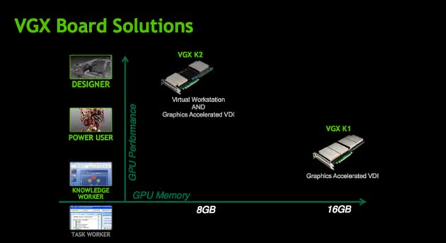 Las soluciones de NVIDIA bajo esta plataforma son la VGX K1 que incluye 4 GPUs Kepler de gama baja, con 768 núcleos CuDA y 16 Gbytes de memoria DDR3, mientras que la VGX K2 utiliza dos GPUs Kepler de gama alta, con 3072 núcleos CuDA y 8 Gbytes de memoria GDDR5.