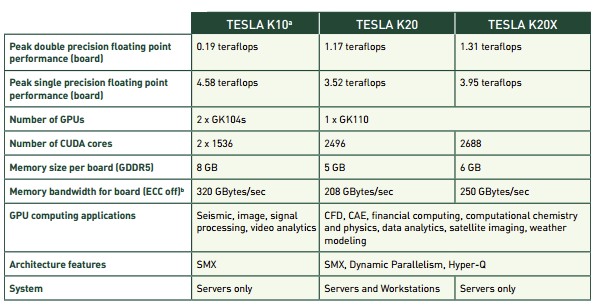 El tope de gama, la Tesla K20X, dispone de 2688 núcleos CuDA, 6 Gbytes de memoria GDDR5 para un ancho de banda de 250 GB/sec y un rendimiento de 1,31 y 3,95 Tflops en rendimiento de doble y simple precisión respectivamente como puedes ver en el siguiente cuadro: