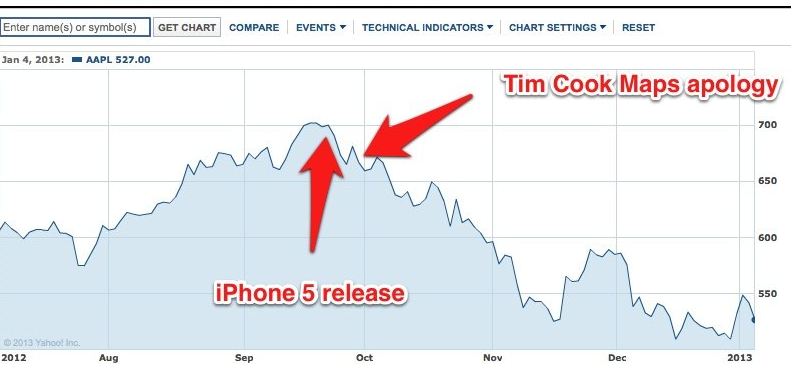 En los últimos meses el valor de los títulos en Bolsa de Apple ha ido disminuyendo paulatinamente. Ha habido subidas y bajadas, pero ha mantenido una caída constante. Son muchas las interpretaciones para explicar esto, aunque la principal, según Business Insider es la del analista de Barclays Ben Reitzes, quien culpa directamente al fiasco de Mapas.