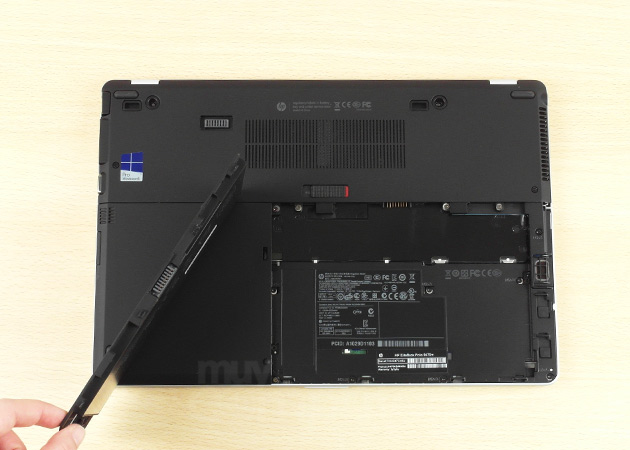 Esto hace que no necesitemos un conector adicional para acoplar el ordenador a una red por cable. También dispone de ranura para tarjetas de memoria y conexión de corriente. En la parte inferior se ofrece una conexión para poder acoplar una segunda batería y aumentar la autonomía del portátil. Como puede verse todo pensado principalmente para el usuario profesional.