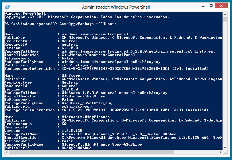 Una vez en el PowerShell será sencillo eliminar por completo estas aplicaciones o para alguna cuenta en particular mediante los siguientes comandos: