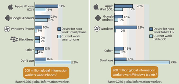 Si miramos hacía el futuro, un 33% de los encuestados dijo que en algún momento querría un iPhone como su próximo smartphone de trabajo, un porcentaje tan grande como el de los que desean teléfonos con los sistemas Android (22%) y Windows Phone (10%) juntos. En el segmento de las tablets, en cambio, las que funcionan con Windows están a la cabeza: un 32% de los encuestados preferiría una tablet Windows como su próximo dispositivo. Por otro lado, muchos de los que no tienen ya un iPad quieren usarlo en el futuro: hasta un 26% desea que su siguiente tablet sea un iPad, más del doble de los que dijeron que quieren una tableta Android.
