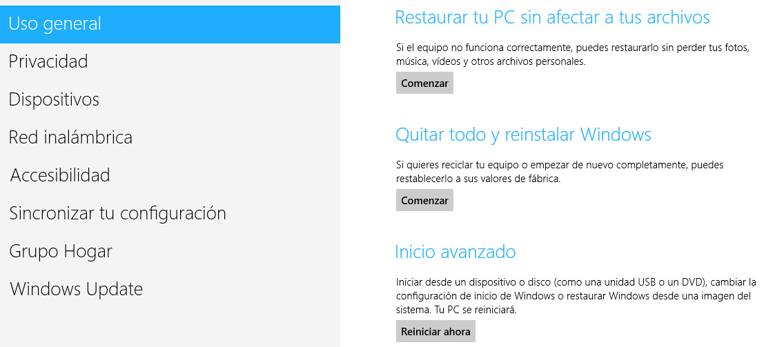 La herramienta de restauración dispone de tres opciones, restaurar el PC sin afectar a tus archivos, eliminar todo y reinstalar Windows y una tercera para Inicio avanzado. El objetivo es el mismo, quitar, limpiar y reinstalar Windows 8 de una manera muy rápida, volviendo el sistema operativo a su configuración predeterminada.