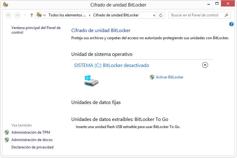 BitLocker puede ser activado en la unidad de disco de sistema operativo (la unidad de disco en que esté instalado Windows 8), en una unidad de disco de datos fija (como un disco duro interno) o en una unidad de disco de datos extraíble (como un pendrive unidad flash USB). Como ejemplo, te ofrecemos una pequeña guía para cifrar la unidad del sistema: