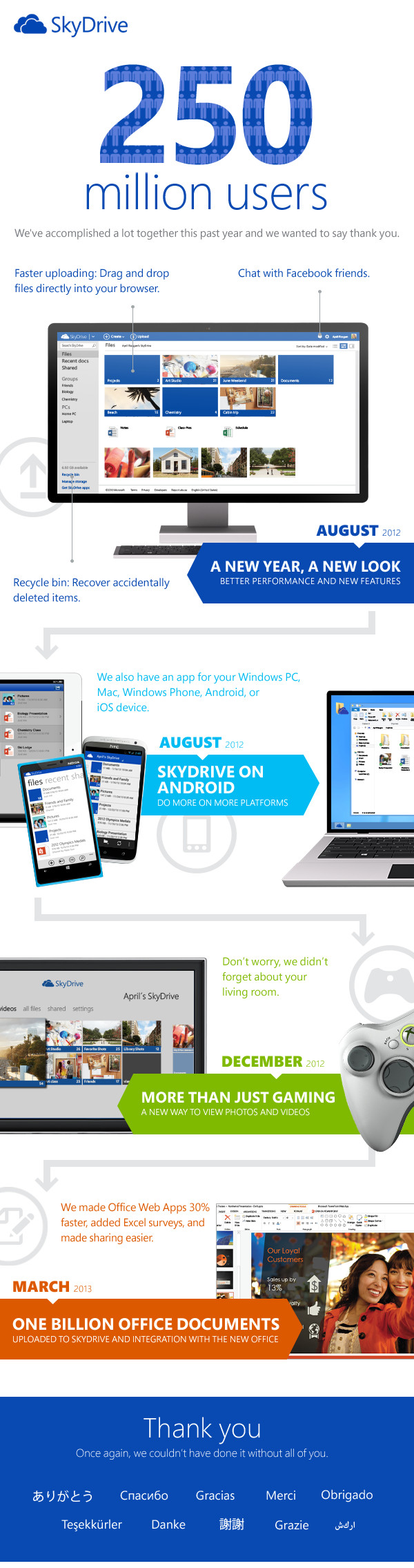 Microsoft compite en el mercado del almacenamiento online a nivel usuario con SkyDrive, un servicio similar al de DropBox o Google Drive. Ahora esta plataforma ha alcanzado los 250 millones de usuarios activos y para ello ha desarrollado una infografía en la que explican los hechos más importantes que ha vivido esta plataforma.