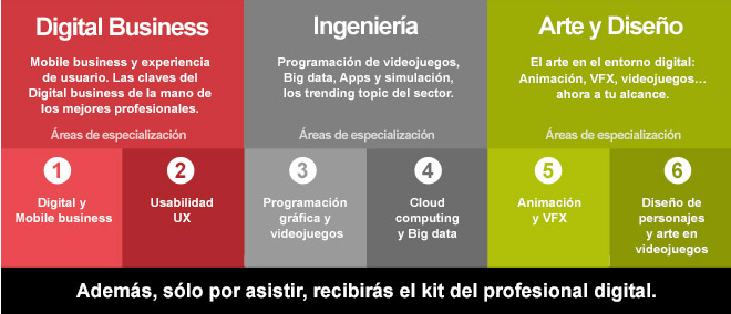 Los asistentes a la jornada de puertas abiertas podrán conocer la propuesta de U-tad en áreas comoDigital Business, Ingeniería o Arte y Diseño. Conocerán de primera mano algunas de las claves de lo que ya se conoce como emprendimiento digital.