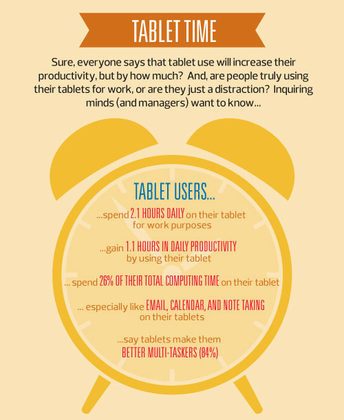 La tableta ha demostrado ser una herramienta que va más allá del ocio, más versátil que un smartphone y más manejable que un portátil, esta tecnología permite realizar una serie de tareas básicas en las que smartphone puede quedarse corto o el ordenador ser demasiado. Los datos de CDW, que entrevistó a profesionales de diferentes sectores como la salud, la educación y el gobierno, no hacen más que refutarlos. En ellos se destaca que esta herramienta mejora la productividad del día a día.