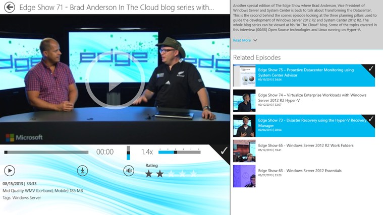La aplicación ofrece en vídeo el acceso a las últimas noticias semanales de productos Microsoft para profesionales IT, incluyendo tutoriales técnicos, información de software u otros recursos, de software como Windows Server, Windows Azure, System Center, Hybrid Cloud o People Centric IT.