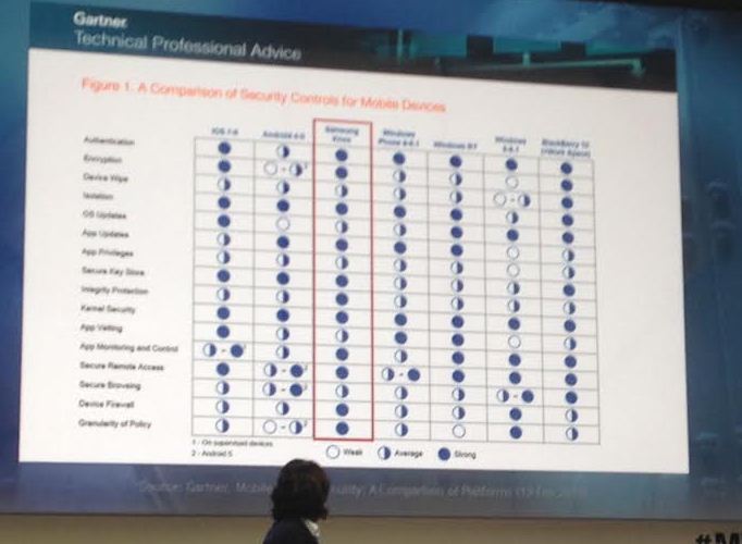 Rhee ha dedicado muchos minutos a explicar la complejidad de desarrollo que implica un proyecto como KNOX y ofrece una visión a largo plazo, planteando un escenario similar al que pronostican consultoras y analistas; despegue del BYOD, más demandad de conectividad y un aumento exponencial en el número y la gravedad de amenzas para el sector profesional. Además, no han dudado en comparar el combo Android + KNOX con el resto de plataformas (iOS incluido, por supuesto) y agradecer el premio Global Mobile a mejor solución antifraude que recibieron hace solo unas horas.