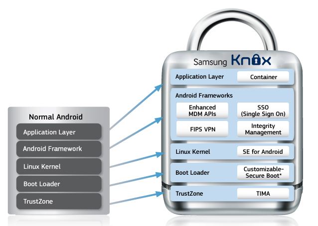 Para Samsung la vocación profesional de su nuevo tope de gama va más allá de una lista de especificaciones técnicas o software aislado para mejorar la seguridad y, aunque no lo expresan de manera explícita, presentan KNOX como una solución global que combina puntos clave del hardware (han destacado el micro de 64 bits, el sistema de carga rápida y la protección Gorilla Glass) con un interesante sistema de seguridad multicapa, cifrado end-to-end y el apoyo de las mejores empresas del sector.