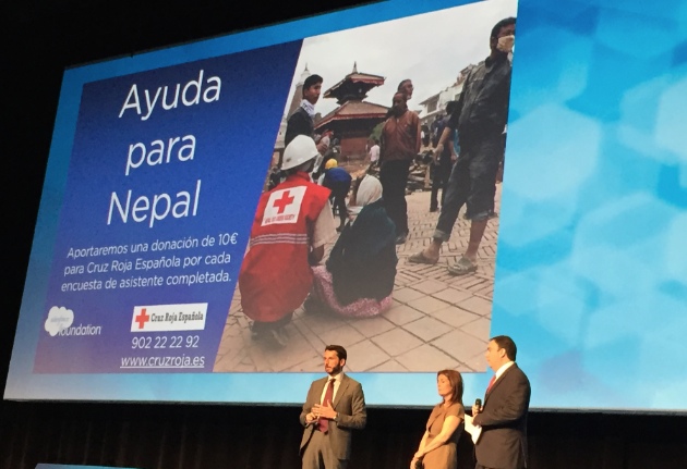 Miguel Milano confirmó la reciente ayuda de 100.000 dólares por parte de Salesforce a los damnificados del terremoto en Nepal, y también que por cada formulario de evaluación del evento rellenado por los asistentes a Essentials Madrid 2015, Salesforce España donará 10 euros a Cruz Roja Española para ayudar en la catástrofe de Nepal.