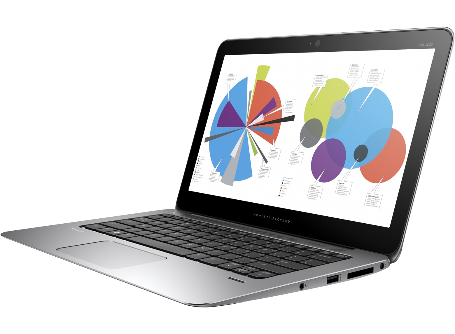 EliteBook Folio 1020 utiliza una pantalla de 12,5 pulgadas de diagonal, con dos paneles IPS en opción con resolución Full HD o QHD, que ofrece colores vibrantes, elevados valores de brillo y contraste, y excelentes ángulos de visión.
