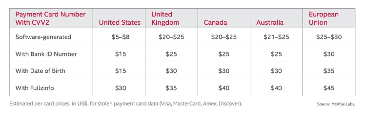 La organización McAfee Labs de Intel Security Group ha examinado precios de datos extraídos de tarjetas de crédito y débito robadas, de datos de acceso a cuentas bancarias, de servicios de transferencia bancaria a cuentas opacas, de datos de acceso a servicios de pago online, de servicios de contenido premium, de redes de empresas, de cuentas de fidelización y de cuentas de subastas online.