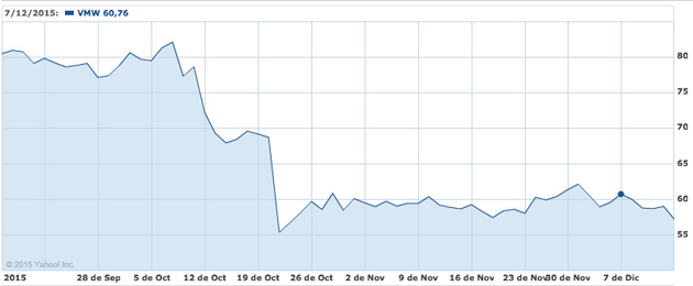 Pero esa medida no genera demasiada confianza (más adelante te explicamos la razón), más bien al contrario, y la suma de esto y la incertidumbre del encaje de VMWare en la nueva superestructura surgida de la combinación de Dell y AMC, ha hecho que sus títulos, que desde principios de año habían cotizado por encima de los 80 dólares estén cotizando actualmente por debajo de los 60.