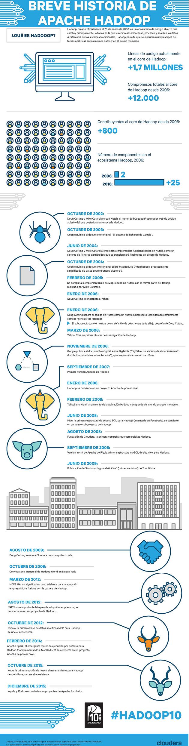 Para celebrar el décimo aniversario de Apache Hadoop, Cloudera ha desarrollado una infografía con todos los datos sobre este framework de software que soporta aplicaciones distribuidas bajo una licencia libre y que permite a las aplicaciones trabajar con miles de nodos y petabytes de datos, mediante el lenguaje de programación Java.
