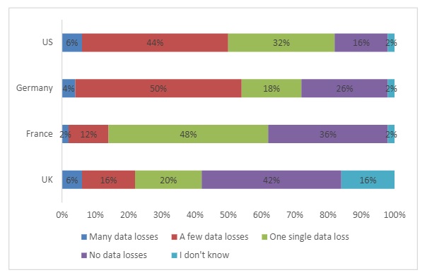Como podemos ver en los gráficos que acompañamos en Alemania y Estados Unidos se encuentran las empresas que más problemas han tenido en este sentido, mientras que Francia y Reino Unido son los que mejor parados salen, aunque presentan un margen de mejora claro ya que incluso en el caso del segundo tenemos en total un 42% de empresas han perdido datos alguna vez en los últimos 12 meses, mientras que en Estados Unidos la cifra se eleva a un 82%.